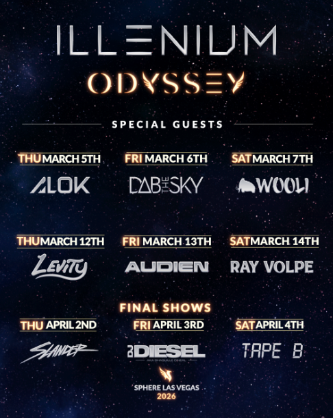 GRAMMY-nominated producer ILLENIUM has released ‘War,’ a collaboration with alternative singer-songwriter Lø Spirit, via Republic Records. Stream it on platforms here. The track coincides with the announcement of special guests for ILLENIUM’s upcoming ODYSSEY residency at Sphere in Las Vegas, scheduled across nine nights in March and April 2026: Alok, Dab The Sky (Dabin x Said The Sky), Wooli, Levity, Audien, Ray Volpe, SLANDER, DJ Diesel (Shaquille O’Neal), and Tape B. ‘War’ combines indie rock elements with alt-pop vocals and electronic production, featuring distorted low-end, guitar riffs, bright percussion, and building tension. The result highlights ILLENIUM’s range in blending heavier, darker tones with atmospheric builds.Fan interest surged after ILLENIUM premiered the track at Apocalypse Festival in Long Beach over Thanksgiving weekend, with performance clips circulating widely online. Here’s what Nick had to say about the release: “So excited to have my new single ‘War’ with Lø Spirit out now. This one was an instant favorite since the rock edge is something I’ve always loved. It brings a darker, heavier energy that contrasts my other singles and adds a new dimension to the story of ODYSSEY” The release follows ILLENIUM’s recent chart success, with ‘Forever’ (featuring Tom Grennan and Alna) hitting #1 on both Mediabase Dance and Billboard Dance/Mix Show Airplay charts. ODYSSEY, ILLENIUM’s sixth studio album, arrives February 6, 2026. The Sphere shows will serve as the exclusive live presentation of the full album, utilizing the venue’s 16K LED display and advanced audio system for an immersive production. ILLENIUM Presents ODYSSEY: Thursday, 3/5/2026: Las Vegas, NV – Sphere – with Alok Friday, 3/6/2026: Las Vegas, NV – Sphere – with Dab The Sky Saturday, 3/6/2026: Las Vegas, NV – Sphere – with Wooli Thursday, 3/12/2026: Las Vegas, NV – Sphere – with Levity Friday, 3/13/2026: Las Vegas, NV – Sphere – with Audien Saturday, 3/14/26: Las Vegas, NV – Sphere – with Ray Volpe Thursday, 4/2/26: Las Vegas, NV – Sphere – with SLANDER Friday, 4/3/26: Las Vegas, NV – Sphere – with DJ Diesel Friday, 4/4/26: Las Vegas, NV – Sphere – with Tape BILLENIUM Announces Full Sphere Support Acts; Releases Latest Single ‘War’