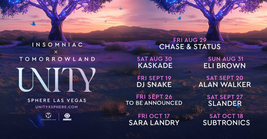 Two titans of the global dance music scene—Insomniac and Tomorrowland—revealed the next wave of artists set to perform at UNITY, the trailblazing new live experience premiering at Sphere in Las Vegas. Headlining on Saturday, September 27, SLANDER will deliver their signature blend of emotionally charged melodic bass, promising one of UNITY’s most electrifying moments. Kicking off the final weekend of the series, Sara Landry takes the stage on Friday, October 17, unleashing her relentless brand of dark, driving hard techno. Then on Saturday, October 18, bass music heavyweight Subtronics will close out UNITY with his explosive, genre-defying sound. More than just a concert, UNITY is an immersive, multi-sensory odyssey that fuses cutting-edge storytelling, orchestration, and full 360° cinematic visuals. A first-of-its-kind collaboration between Insomniac and Tomorrowland, each night invites fans into a new world, culminating in a headline performance from one of the planet’s most dynamic electronic artists. “We are thrilled to announce we are closing the night at Sphere in Las Vegas on September 27th for Insomniac x Tomorrowland present UNITY, ” said SLANDER. “Ever since this venue opened its doors we have been plotting on how to make something special happen. We are so grateful to our friends at Insomniac and Tomorrowland for granting us this once in a lifetime opportunity to showcase our music at the world’s most advanced live entertainment venue. We are preparing a very special set for this one night only occasion. We hope to see you there!” I’m very excited to be playing Sphere for the first time,” said Sara Landry. “It’s going to be so special, in a truly immersive way, and to do it with two of my favorite promoters as well — I can’t wait.” “In 2023 I posted it was a dream of mine to play Sphere and here we are now!” stated Subtronics. “I’m so honored to be able to perform there and close out the entire UNITY series on the final night with Insomniac and Tomorrowland!” For over a decade, Insomniac and Tomorrowland have stood at the pinnacle of global dance music culture—bringing millions together through iconic festivals that celebrate music, creativity, and connection. Now, for the first time ever, their visionary worlds unite inside the groundbreaking Sphere for a truly immersive, next-level experience. This summer, audiences will journey through Tomorrowland’s legendary realms—Planaxis, Adscendo, and Orbyz—fused seamlessly with Insomniac’s vibrant universes from Beyond Wonderland, Nocturnal Wonderland, Escape, Countdown, and EDC. The result: a breathtaking, multi-sensory adventure unlike anything the dance world has ever seen. As trailblazers in the electronic music scene, Insomniac and Tomorrowland continue to collaborate with some of EDM’s most iconic and forward-thinking artists, redefining the future of live entertainment on a global stage. 🎟 Limited tickets for UNITY at Sphere remain for September 19–20, September 26–27, and October 17–18.Tomorrowland & Insomniac Reveal Full Lineup for Sphere Takeover